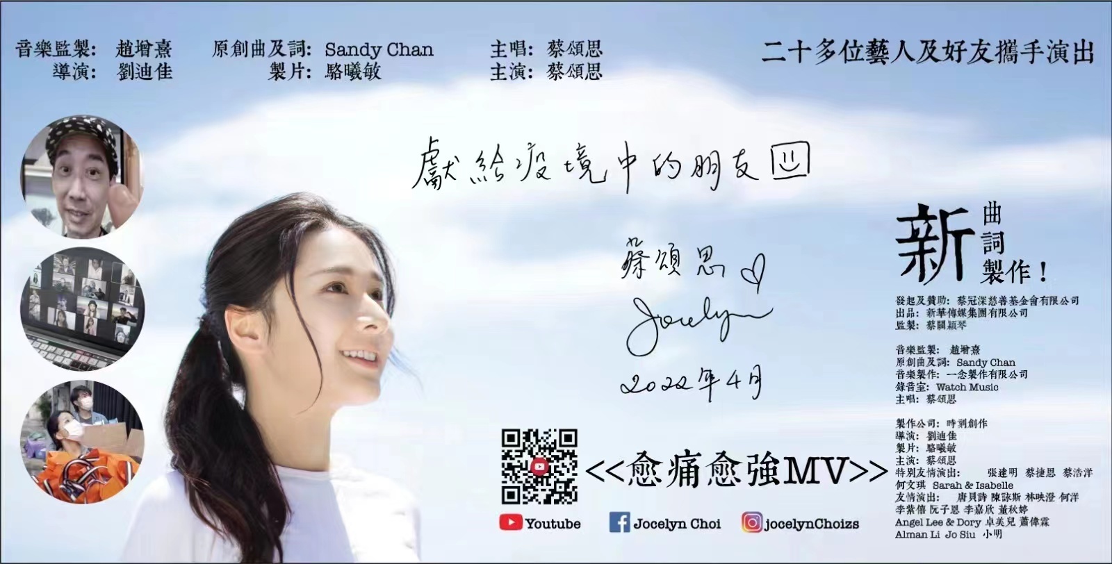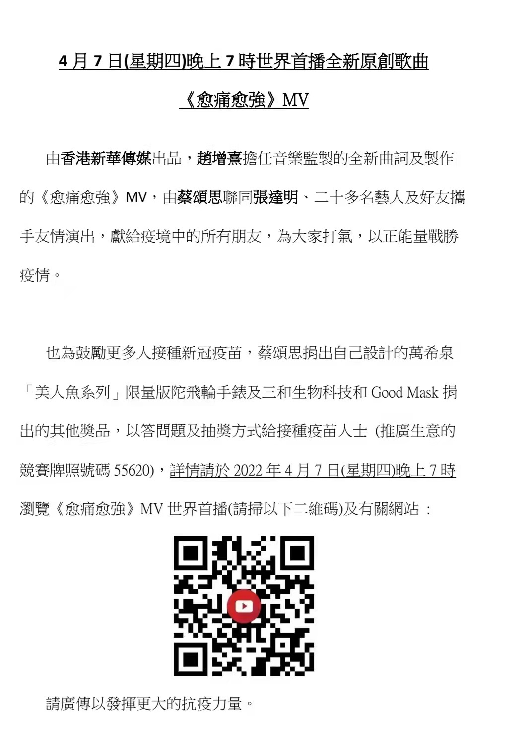 4月7日晚7时,由香港新华传媒出品、赵增嘉担任音乐监制的全新曲词原创MV《愈痛愈强》,将在YouTube上进行世界首播。本MV由香港实力派青年演员蔡颂思联同张达明等二十多位圈内人士携手友情演出,旨在用正能量的声音,为身处疫情中的所有朋友加油打气。