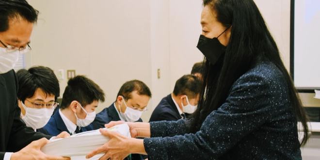 胡桃香气(中)出席会议,该会议指控新法取消了对18-19岁女性在AV产业中受到的保护