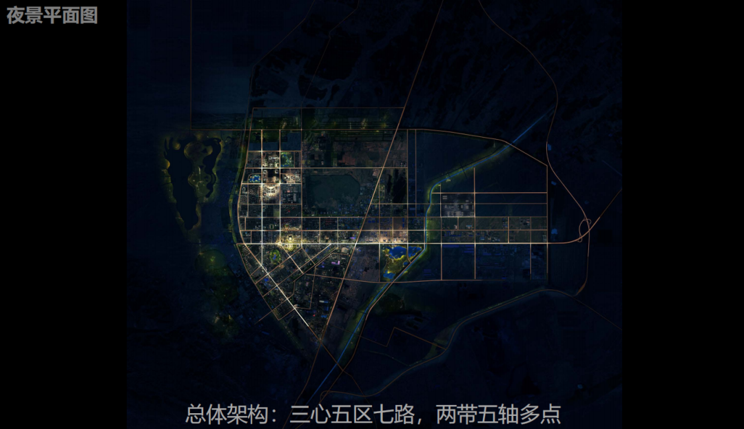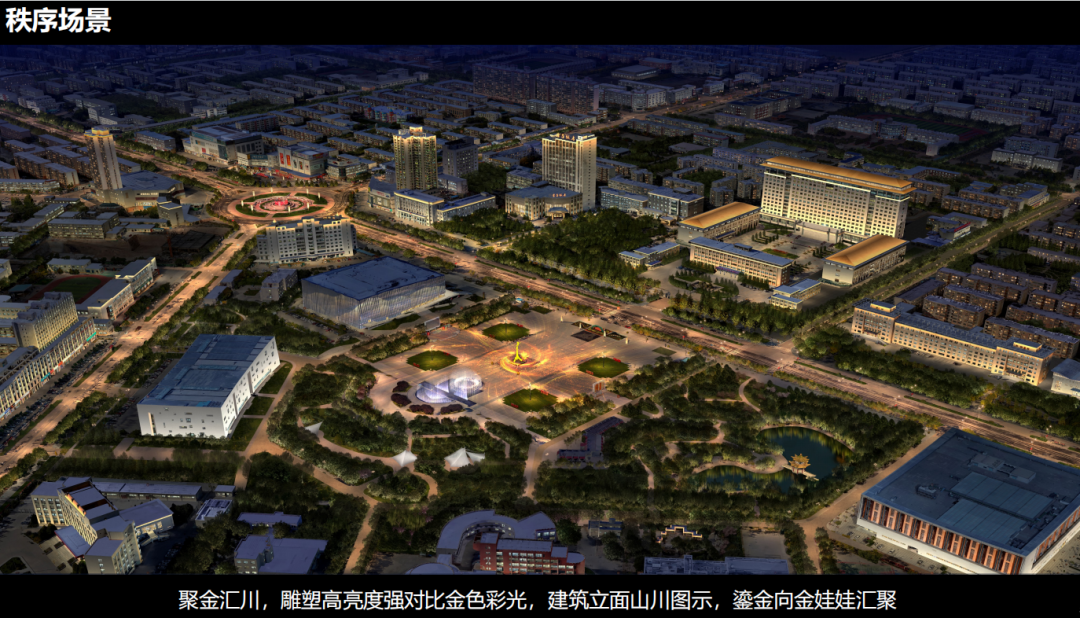 规划以“金色镍都、精致绿城”为目标,对城区道路、建筑、景观带等进行照明设计,形成“三心五区七路,两带五轴多点”的夜景照明总体架构,通过控制亮度、色温、动态秩序,实现对城市照明全覆盖的规划管控,打造美观大气、独具特色的城市夜景,体现我市现代化工业城市坚毅、精致、充满希望的城市特色。其中,“三心”指的是老城活力核心、龙首活力核心、金水活力核心;“五区”指中心城区、龙首新区、金水新区、生态旅游区、金川工业区;“七路”包含新华大道、北京路、昆明路、天津路、建设路、上海路、公园路;“两带”指工业锈带、生活秀带;“五轴”指新华大道发展轴、功能融合发展轴、老城生活轴、龙首行政轴、金水产业轴;“多点”指金川公园、全民健身中心、人民文化广场等。