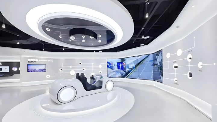 既然是科技展厅设计,那么在展厅的整体观感上一定要具备科技感,我们可以通过外观酷炫的多媒体设备、科技元素硬装以及灯光控制,来对展厅整体进行氛围渲染,从而突显科技主题。