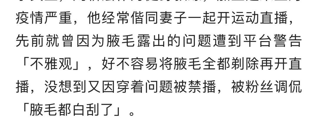 此前,刘畊宏因腋毛太过旺盛直播间被平台警告。为此,他特意刮了腋毛。结果又因为胸肌被禁了。只能说刘畊宏的身材太好了才导致这种情况。