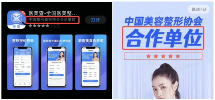 更有甚者,这款App下载页显示“中国整形美容协会会员单位”,下载完成后欢迎页赫然几个大字“中国整形美容协会合作单位,美呗医美查”。“会员单位”“合作单位”切换自如,未免太过于随意了。