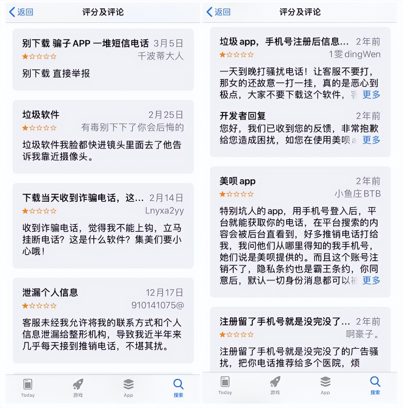 对于美呗医美查App,有用户评价:“收到诈骗电话,觉得我不能上钩,立马挂断电话?这是什么软件?集美们要小心哦!”也有用户留言:“一天到晚打骚扰电话!让客服不要打,那女的还故意一打一挂,真的是恶心到极点,大家不要下载这个软件。”