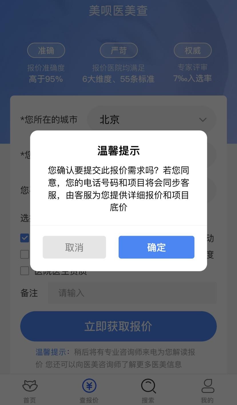 进入首页后,下方导航栏可以看到共有“首页”、“查报价”、“搜索”、“我的”四个板块。点击“查报价”后,则需要选择所在城市、意向项目、喜欢风格、选择机构时关注的因素等,选择完成以后,点击下方“立即获取报价”,则会收到提示“您确认要提交此报价需求吗?若您同意,您的电话号码和项目将同步客服,由客服为您提供详细报价和项目底价”。