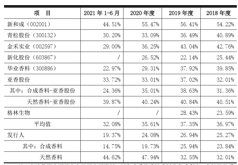 对比同行业上市公司,万香科技的毛利率水平也远远不如。例如,新和成(002001.SZ)香精香料业务毛利率2020年为55.47%,新化股份(603867.SH)香精香料业务毛利率为26.52%,可比公司毛利率平均值在2020年为35.61%,而万香科技仅为24.08%。对此,万香科技在招股书中的解释为,新和成、青松股份(300132.SZ)、金禾实业(002597.SZ)等公司属于行业或细分产品的龙头,经营规模与定价权优势高于万香科技。而从售价来看,万香科技主要产品MDJ、龙涎酮、左旋香芹酮、乙基麦芽酚、薄荷油等售价均在2020年出现了一定幅度的下滑,其中龙涎酮单价下降34.34%,2021年上半年又继续下滑1.68%。