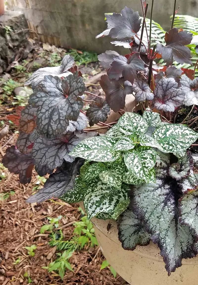 上面是矾根、嫣红蔓和蟆叶秋海棠组合搭配的盆栽