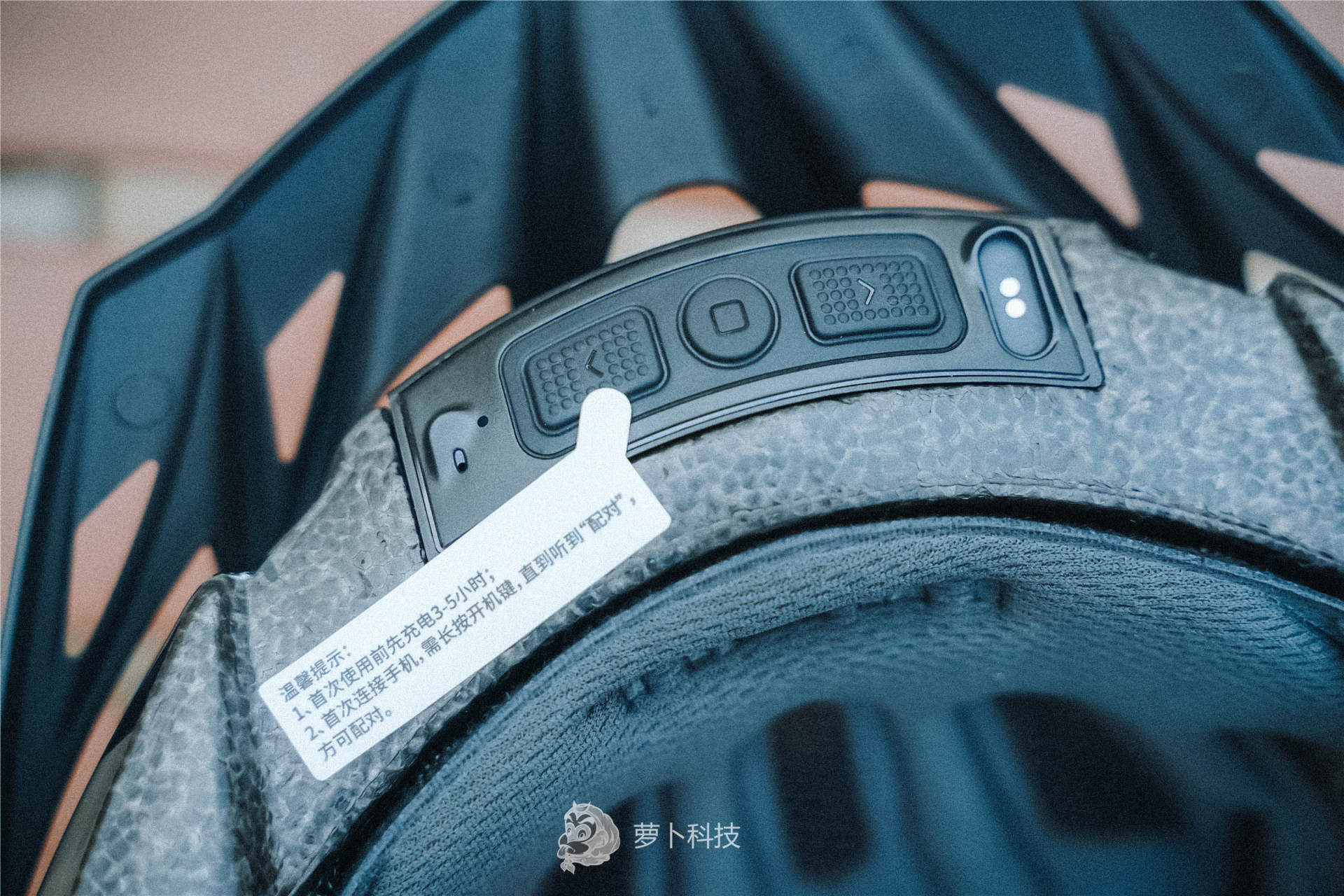 头盔左右侧是扬声器,前部则是控制区域,是开关机按键和磁吸充电接口。初次购买的用户可以参考附赠的说明书熟悉按键功能,熟悉后就能盲操作了。