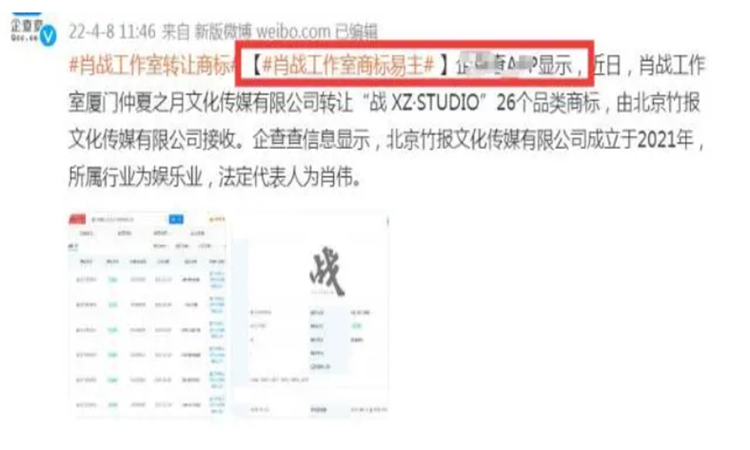 肖战转让商标的受让公司——竹报传媒公司成立于2021年8月,法定代表人为肖伟。熟悉肖战的网友应该都知道,网传肖伟是肖战的父亲,竹报文化也是经营多种娱乐文化项目的公司,竹报传媒公司很有可能是肖战父亲代肖战建立的公司。