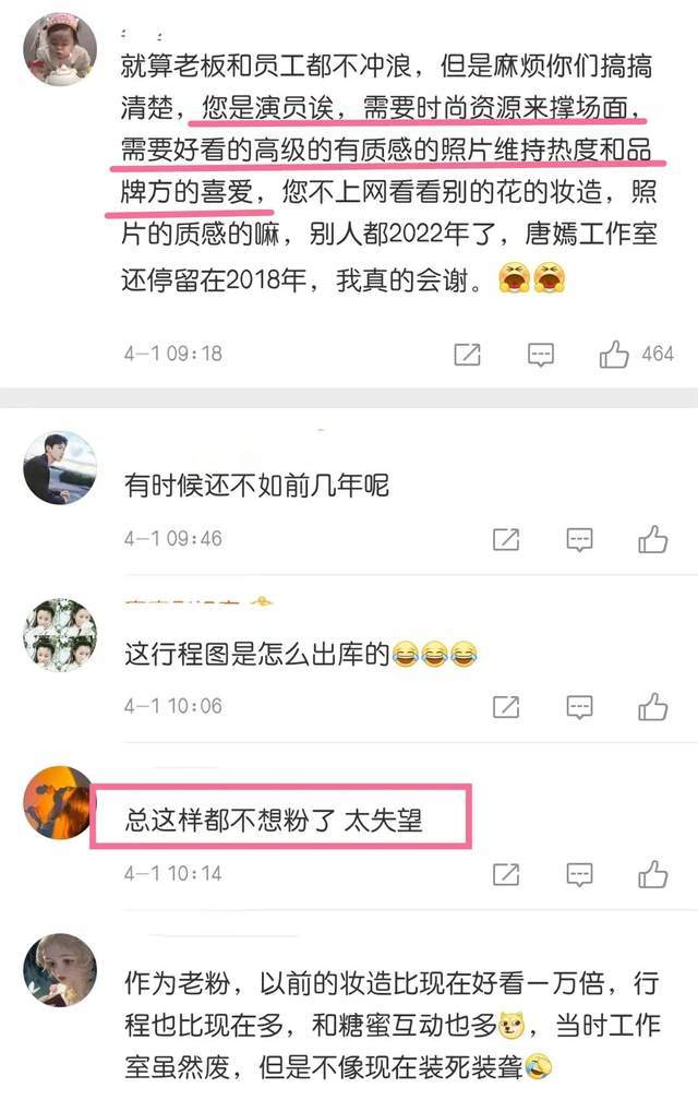底下一批粉丝在“骂”,骂工作室的有很多,指责唐嫣的也不少,基本都是说工作室“不作为”,唐嫣的化妆和造型越来越拉胯,还不如以前,甚至很多粉丝被磨得没耐心说要“脱粉”。