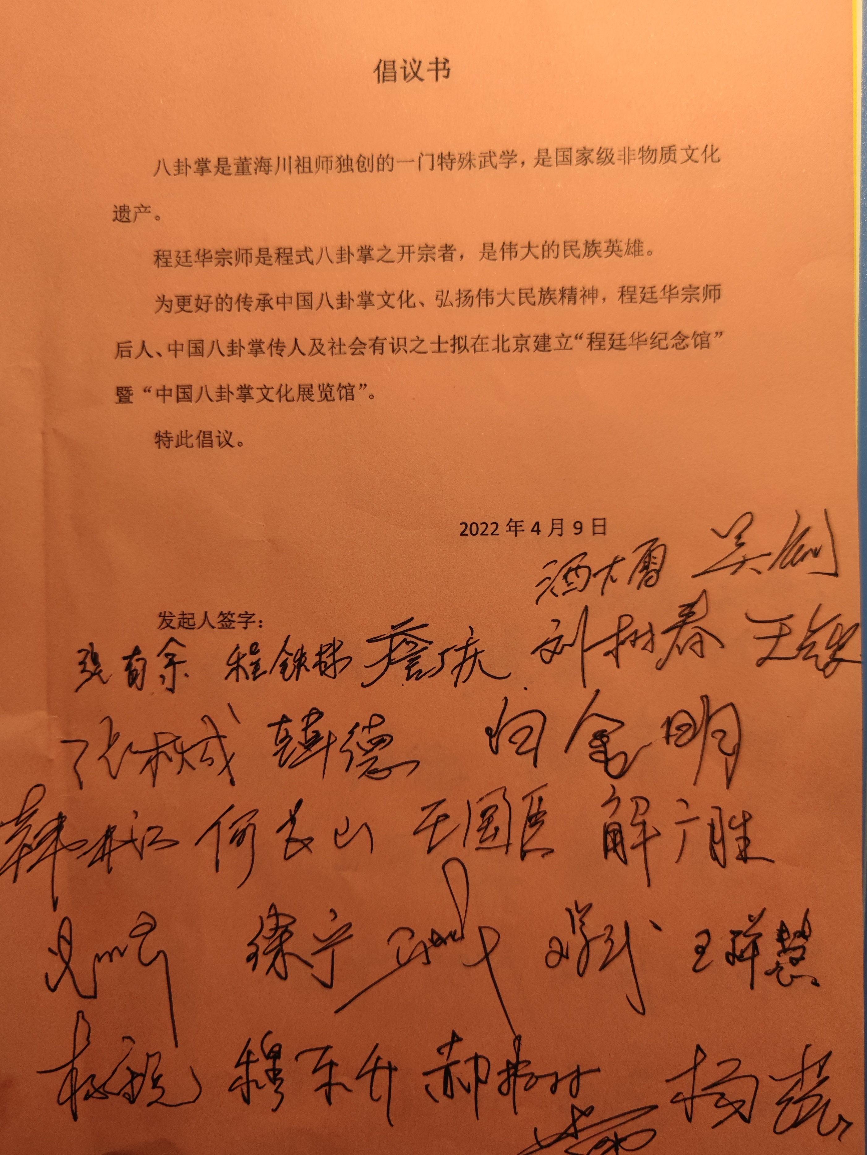 为更好地传承中国八卦掌文化、弘扬伟大民族精神,程廷华宗师后人、中国八卦掌传人及社会有识之士拟在北京建立“程廷华纪念馆”暨“中国八卦掌文化展览馆”。由詹厂庆先生、程铁林先生向张有余先生颁发《程廷华纪念馆——中国八卦掌文化展览馆》牌匾,标志着八卦掌宗师程廷华纪念馆筹备活动正式启动。全体与会嘉宾还在筹建程廷华纪念馆的倡议书上签了字。