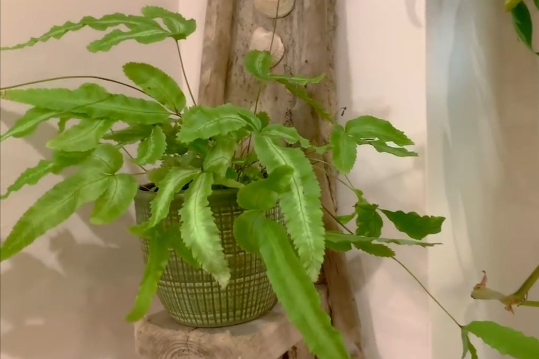 卫生间里最少不了的就是蕨类植物,这一盆就是银脉凤尾蕨,平常养护需要经常给它喷水,在浴室里面高湿度和高温度的环境下,就生长特别良好,养护的过程中,只需要定期浇水,就能保持良好的生长状态。