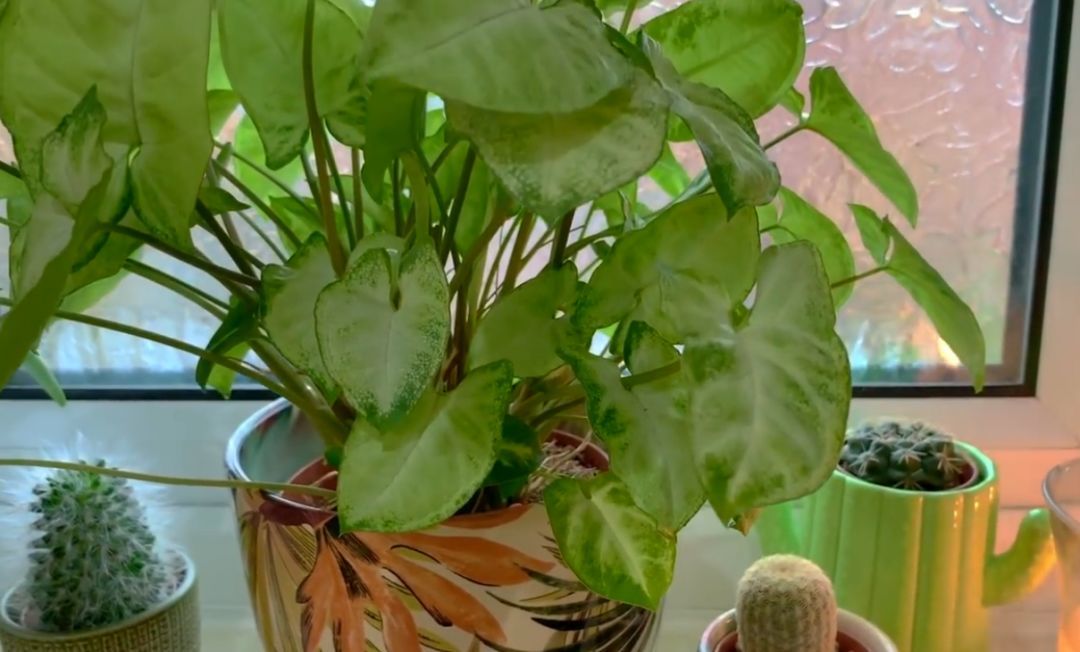 这盆植株比较大的就是白蝴蝶,有人就叫它合果芋或箭叶芋,它的叶片有点像一个箭头。