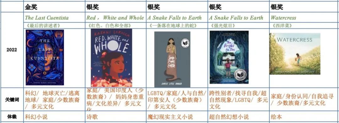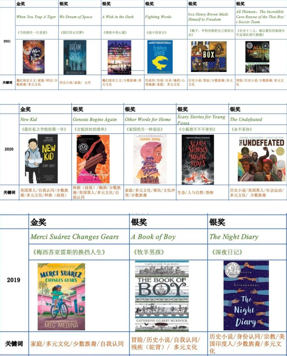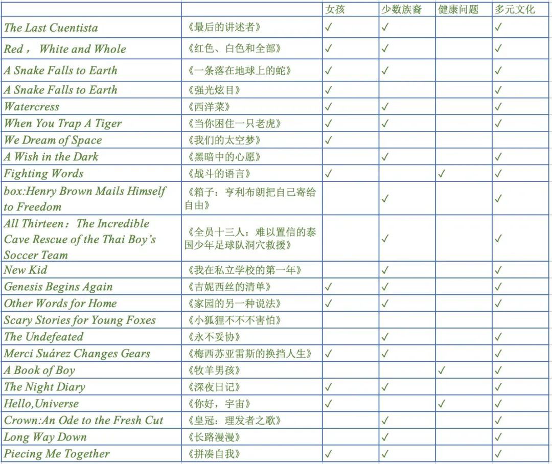 再进一步来看2022年纽伯瑞儿童文学奖的获奖作品,5部中有4部的主角都属于少数族裔,作者们在创作时力图以多元文化为载体,展现文化的传承与碰撞。如果把范围再扩大些,列举出近五年来获得纽伯瑞儿童文学奖的23本书,也会发现有多本作品都涉及多元文化,其中就包括前文中提到的《老虎》。
