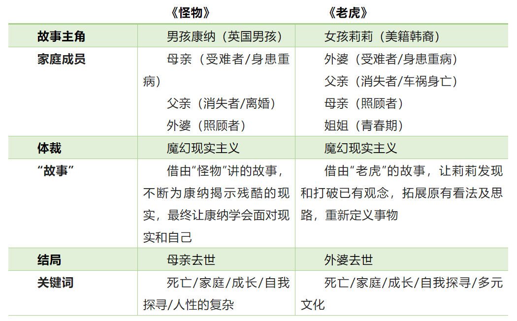 尽管两者内容上有些许差别,例如《怪物》详细地描写了母亲的病情恶化,《老虎》对外婆的病情却草草带过;《怪物》对于母亲的死亡介绍得相对较少,《老虎》则细致入微地写了外婆去世的场景,十分感人;《怪物》的主题整体上较为单一,故事推进的同时贯穿康纳的心理问题和与外婆的冲突,但《老虎》中出现了更多的元素,除了推进文章的主线——外婆的病情恶化,还有其他支线,比如外婆还是一个韩国人(多元/亚洲文化),妹妹有阅读障碍,全家搬迁(面对一个新环境以及新方式的文化冲击),等等。