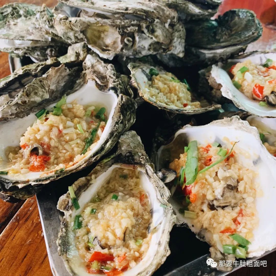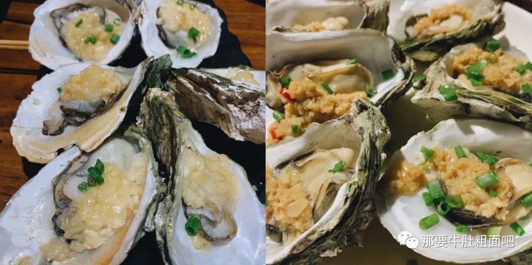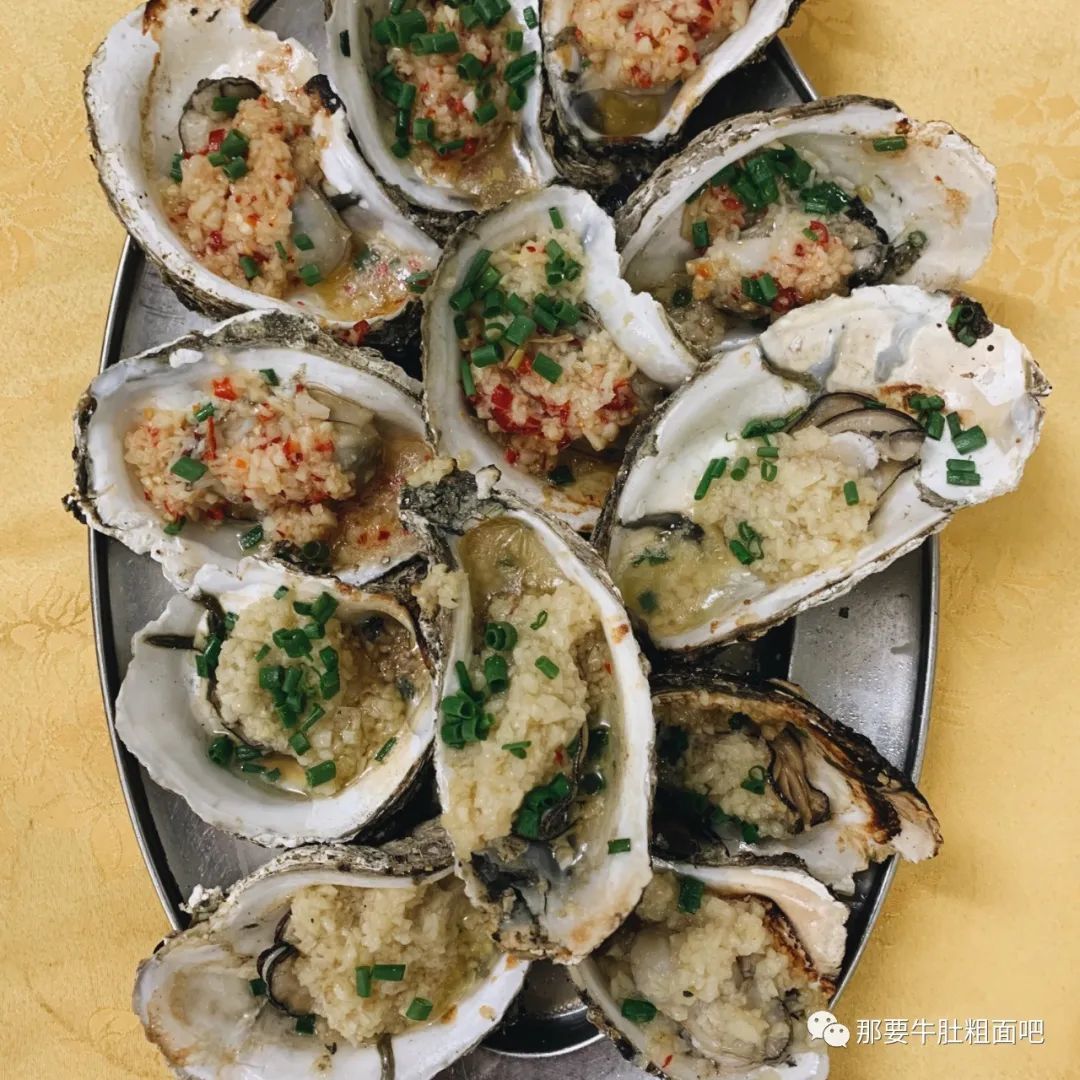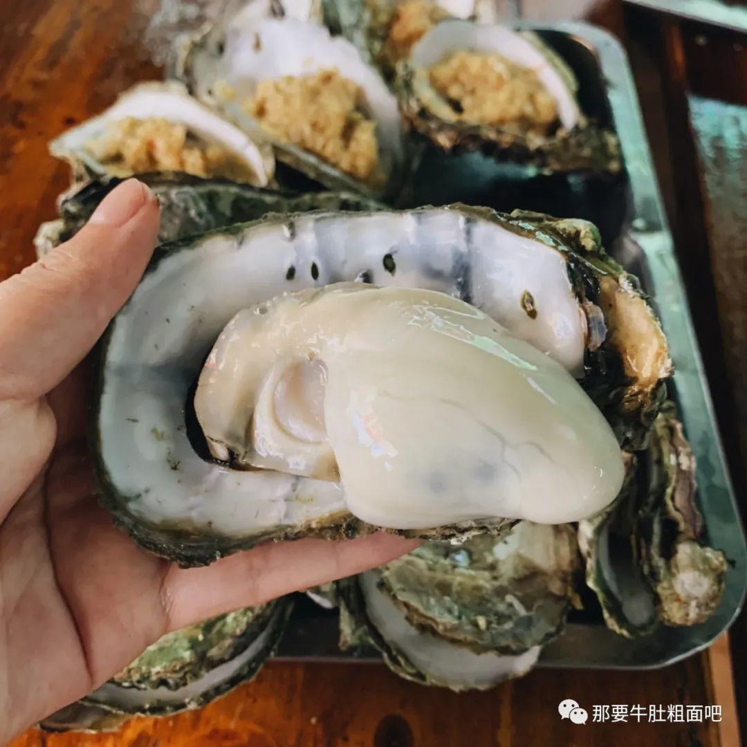 全城排挡吃了不下四五家,口感大差不差,价格也相似,当时(21年10月)平均5.5-8元一个,只是品质像开盲盒。除了 蒜蓉,也流行整只烤的 原味,撬开蚝壳之前,不知道是紧缩干瘪的一小团,还是大过手掌的鲜味炸弹。
