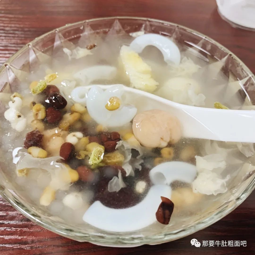 还有 清补凉,这家叫 聚椰坊,从绿林食府出来拐个弯就到,店门正对着南海舰队招待所,深夜坐得满满当当。椰子水打底,十来种食材,通心粉放在里面竟也不违和。比起广府,风格更接近一峡之隔的海南。