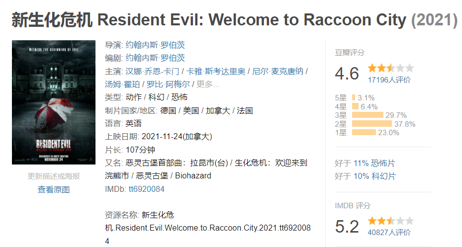 IT之家了解到,德国康斯坦丁影业在 2021 年还推出了一部全新重启的《新生化危机》,演员大换血,不过口碑却迎来惨败,B站没有上线这一部。
