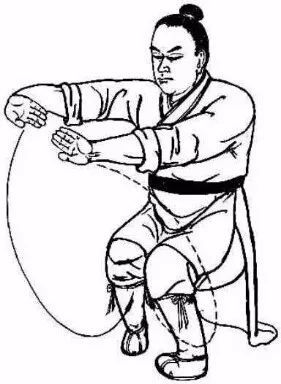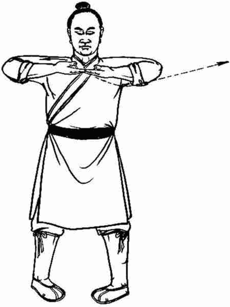 吸气抬掌在胸前,舒臂射箭把弓擎。