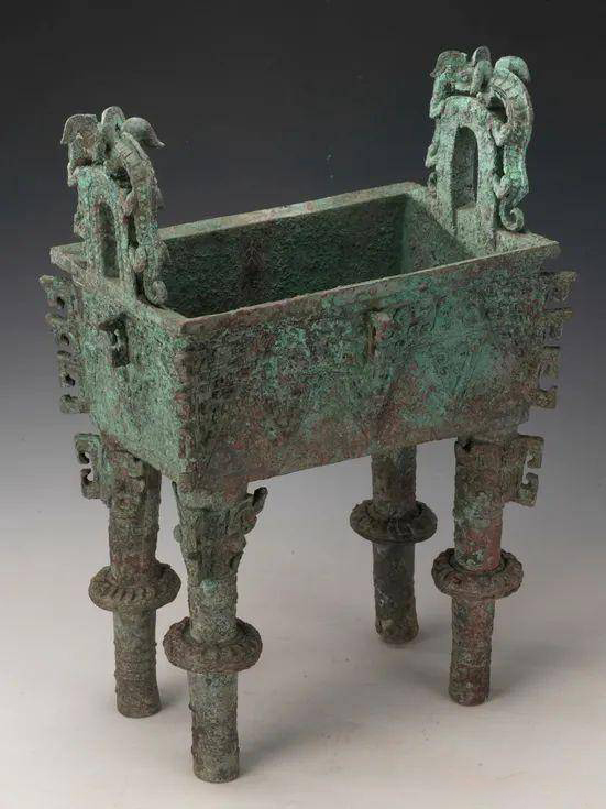 西周太保鼎为四足方鼎,口上铸立双耳,耳上浮雕双兽。柱足上装饰的扉棱和柱足中部装饰的圆盘,在商周青铜器中是独一无二的,甚为奇异。鼎腹内壁铸“大保铸”三字,据考证,“大保”即为“太保”,因此这件方鼎被称作太保鼎。太保鼎造型独特、纹饰优美,具有非凡的艺术魅力,是难得一见的古代青铜艺术珍品。