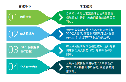 由于线上医保支付处于摸索阶段,目前互联网无法完全替代实体医院及线下药店的职能,但随着互联网医院医保政策的逐步开放落地,预测在医保对接、处方监管、费用控制方面进度将会逐步推进。