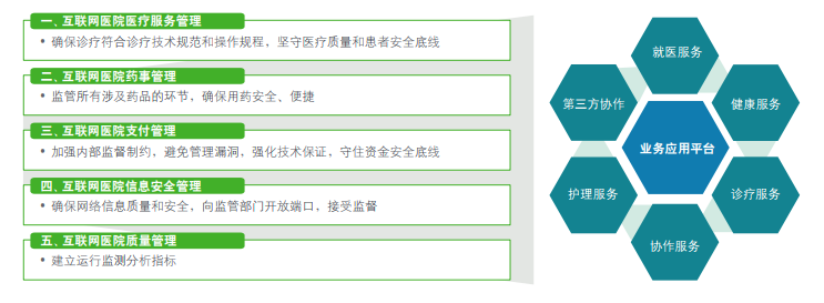 互联网医院的成功运营不仅仅依靠高科技,也需要全方位的管理体系。根据自身特点,建立互联网医院管理体系,包括医疗服务管理、医院药事管理,医院支付管理、信息安全管理以及医院质量管理体系,帮助线上线下一体化,实现互联网医疗生态圈深度融合。