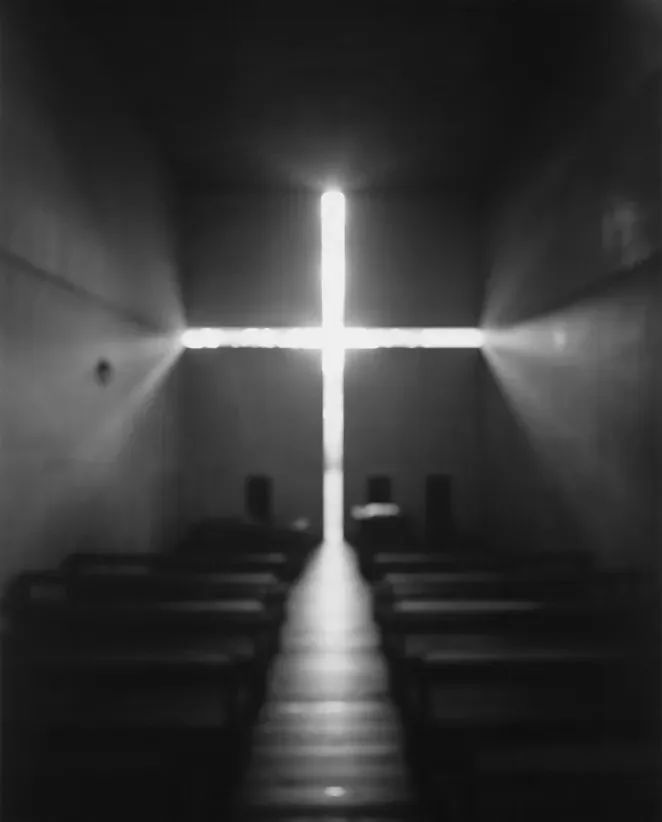 光透过镂空的混凝土,在黑暗的室内投射出清晰的十字架轮廓。