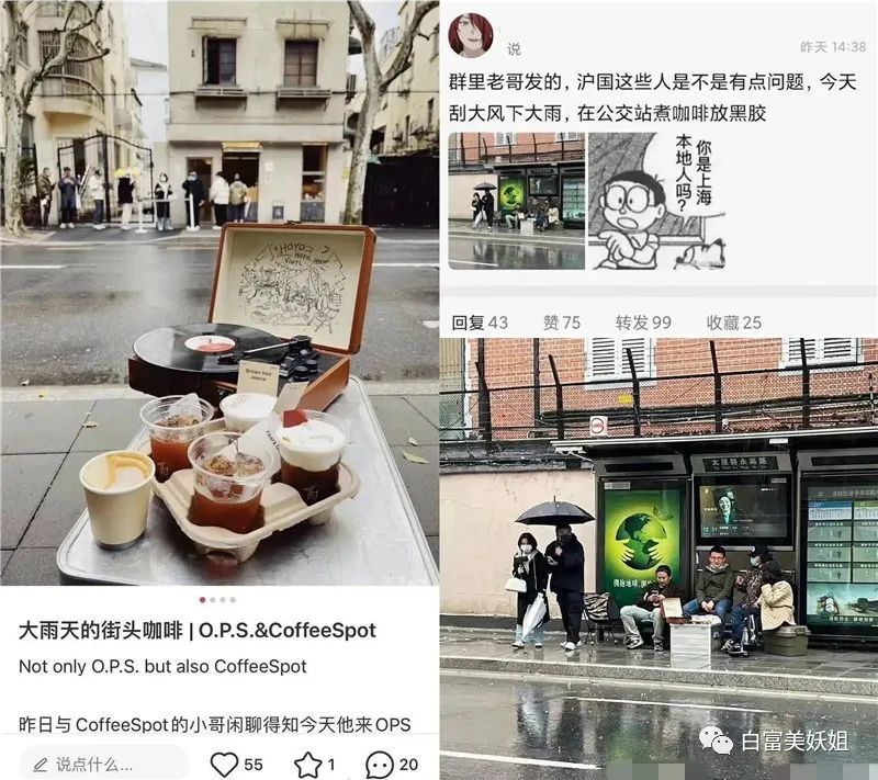 (当事人澄清是下雨天买了咖啡在公交车站躲雨)