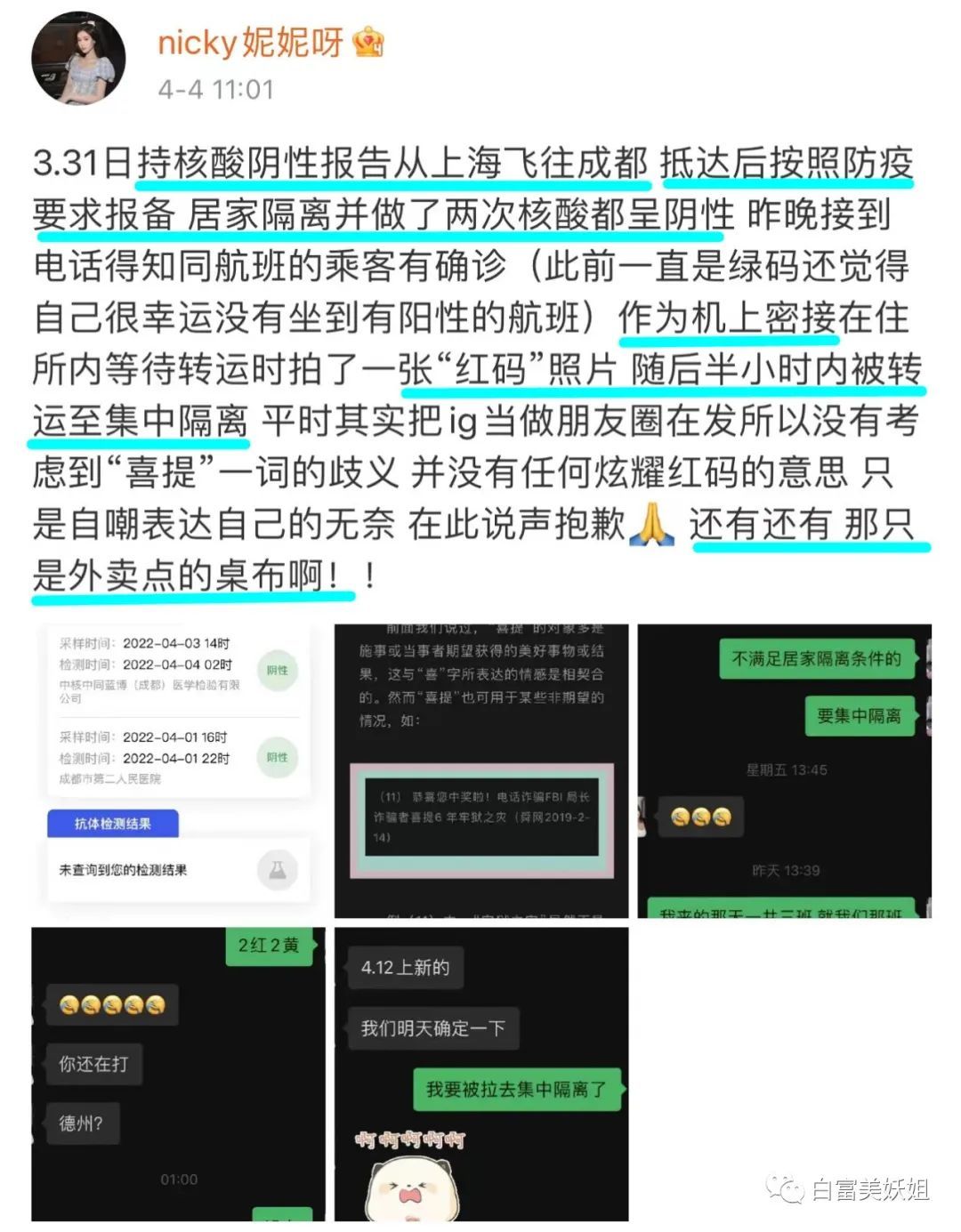 随后妮妮澄清,自己带着核酸报告从上海飞成都,严格遵守防疫要求。