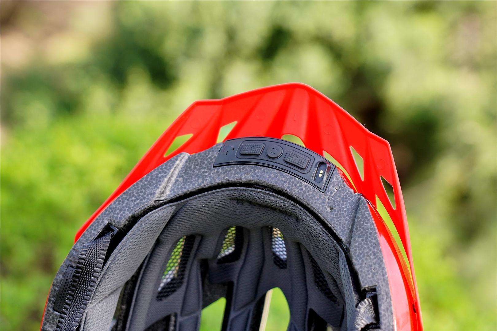 头盔的前部是控制区域,中间为开机键,这里内置了切歌(音量)按键,麦克风以及磁吸式充电口。在头盔的两侧还分别设计有0.5W的立体声扬声器,用来骑行时欣赏音乐,当然音质就不用太强求了,为了安全它也不会做的很大声,毕竟骑行的时候还需要注意环境。