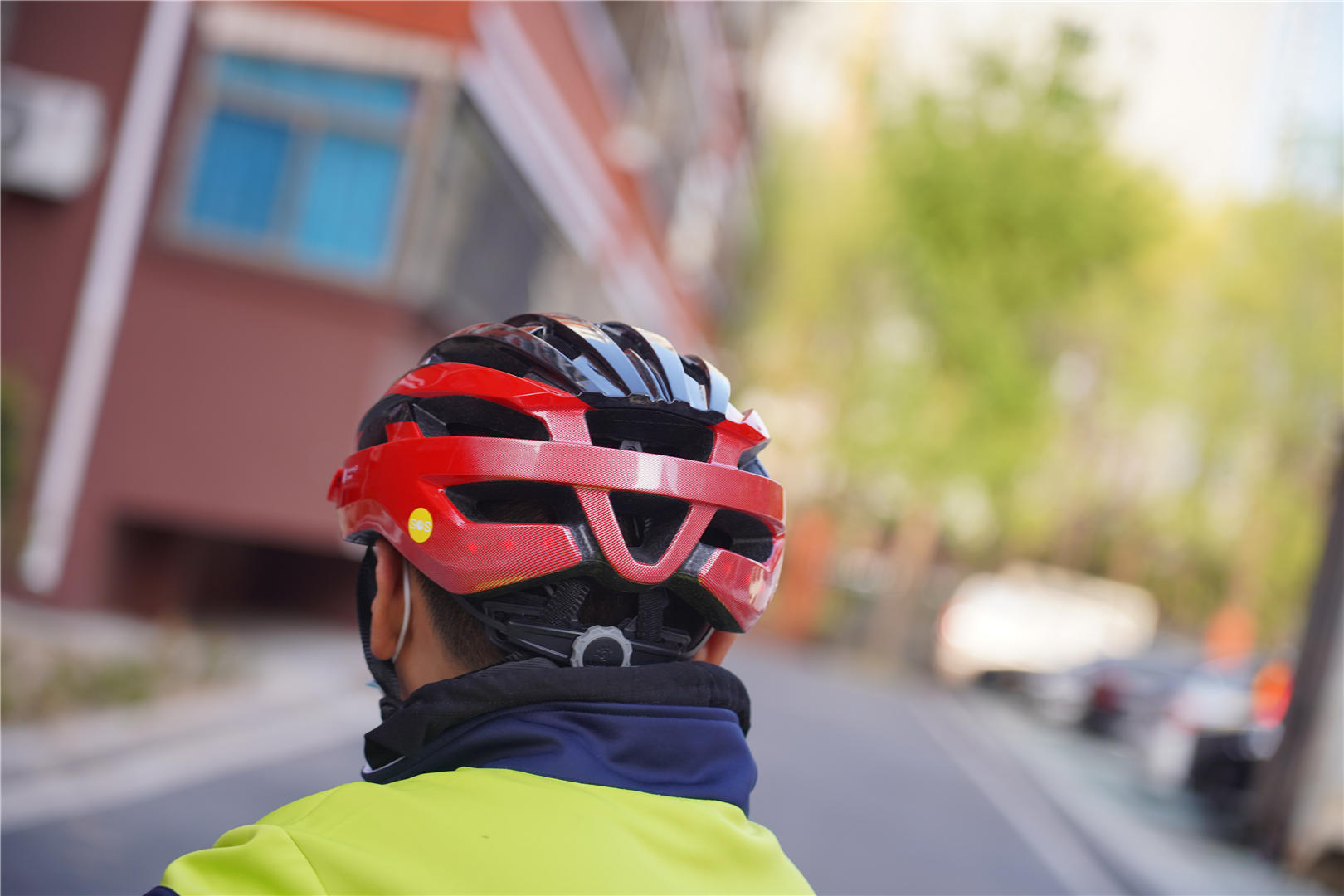 说到是智能头盔,就需要带有一些使用的智能功能,比如摔倒报警(SOS 自动求救)功能。看到圆形黄标了吧,这就是表明这款头盔具有SOS 自动求救功能。当你骑车或者意外摔倒的时候,会自动触发这个功能,APP将发送精准定位和求救信息给预设好的紧急联系人,是不是特别的人性化。