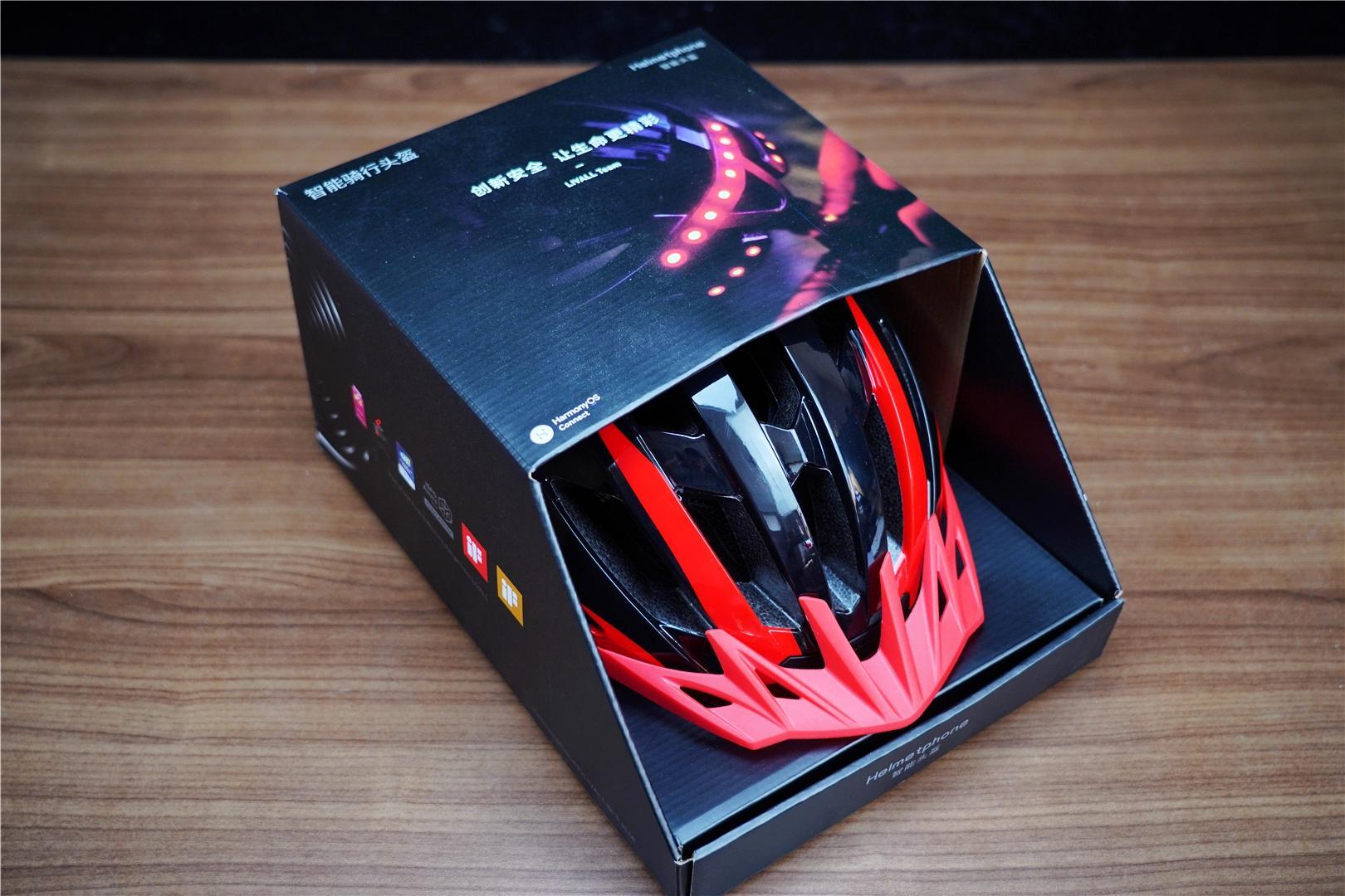 Helmetphone MT1 Neo智能骑行头盔的外包装,设计还是挺有个性的,采用这种半镂空风格,我把内部的包装去掉,这样你可以清晰的看到头盔的外观。此外在正面的左下角可以看到华为“鸿蒙智联”专属的HarmonyOS Connect也图标。如今很多设备都开始支持鸿蒙系统,这款智能头盔也不例外。
