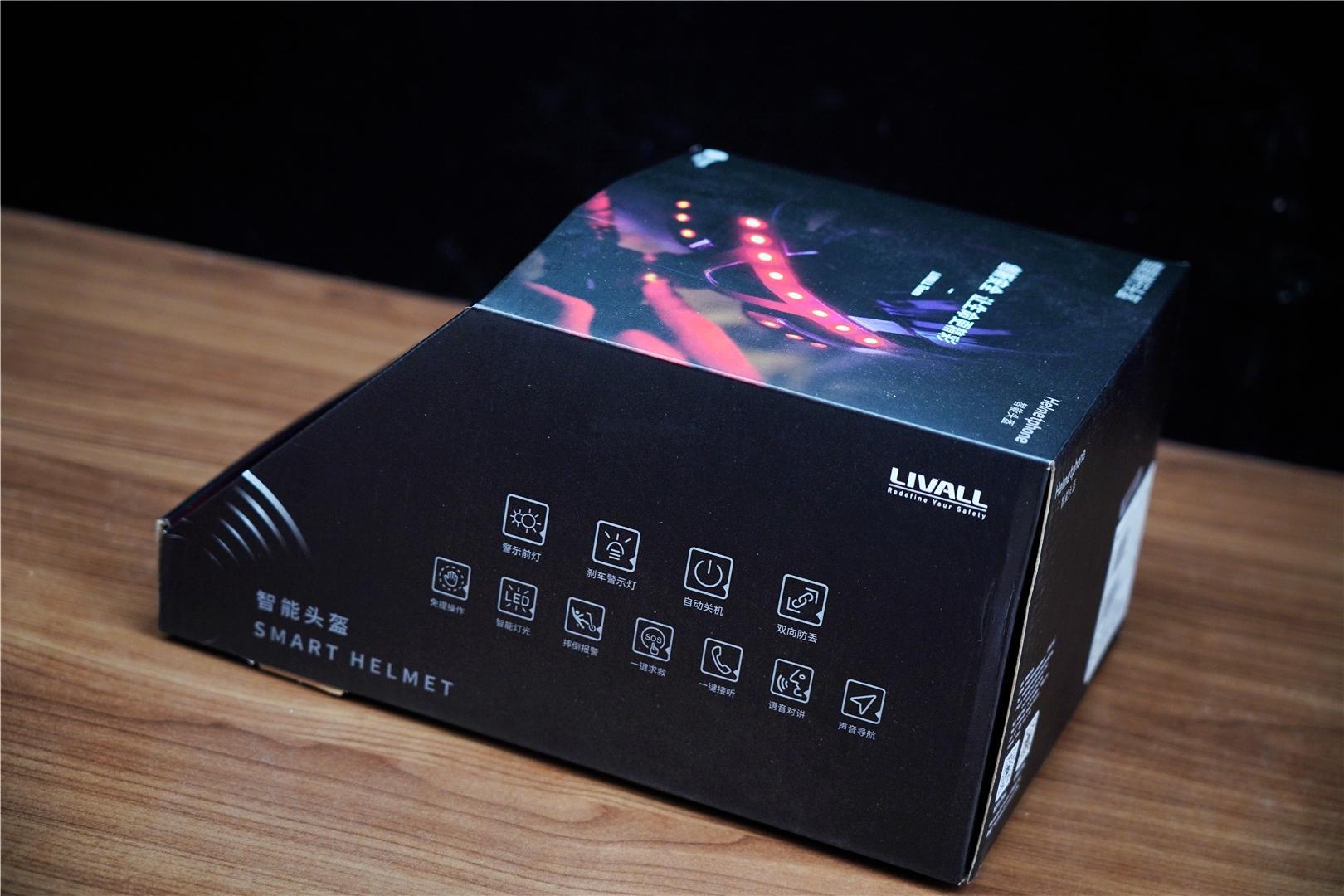 包装盒的侧面标有这款Helmetphone MT1 Neo智能骑行头盔的主要特点:双向防丢、一键接听、摔倒报警、语音导航、语音对讲、智能灯光等。