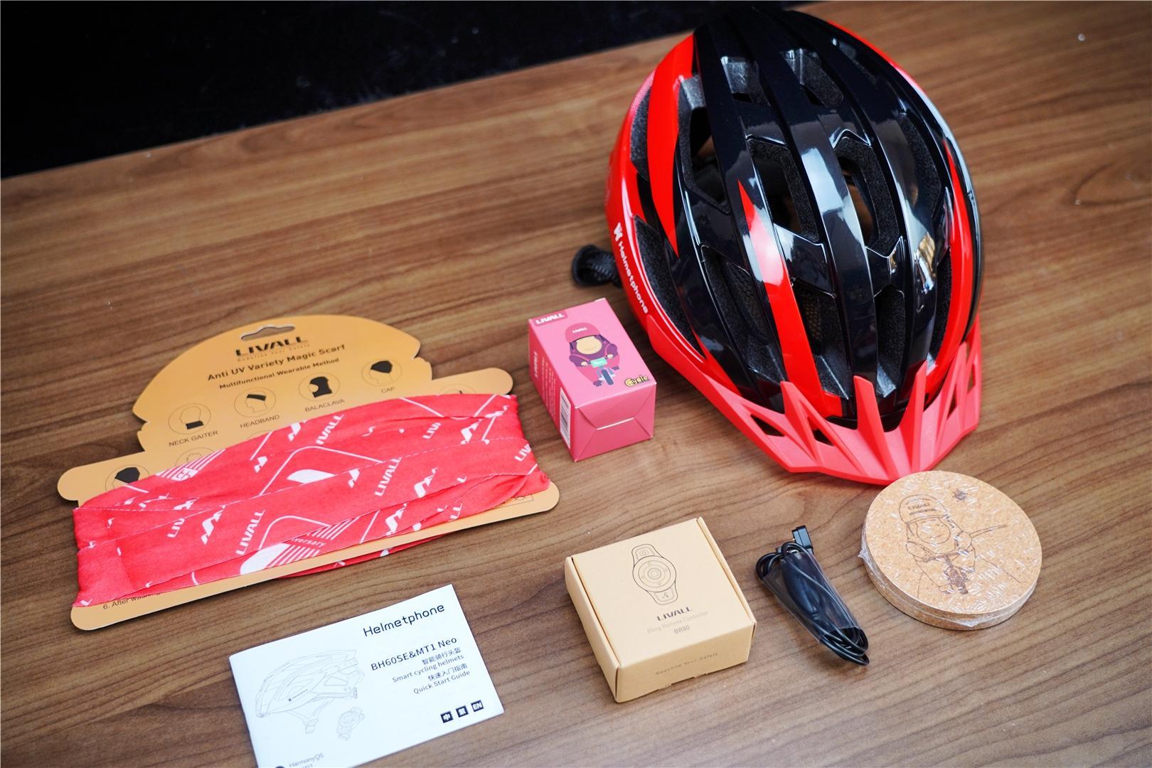 直接来看全家福,不得不说配件还是很全面的,Helmetphone MT1 Neo智能骑行头盔、遥控器、说明书、磁吸式充电线,以及附带的骑行围巾、还有杯垫和钥匙扣。