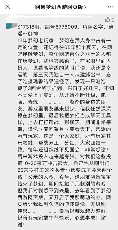 从不少玩家主动分享的游戏经历中也不难看出,在网吧里度过的那些青春是多么珍贵。即便玩家已从“20岁打工小伙”变成了“两个孩子的父亲”,但对那些在游戏中与好友一起度过的时光,仍然可以精准地回忆起每一个细节,并为之感动不已。