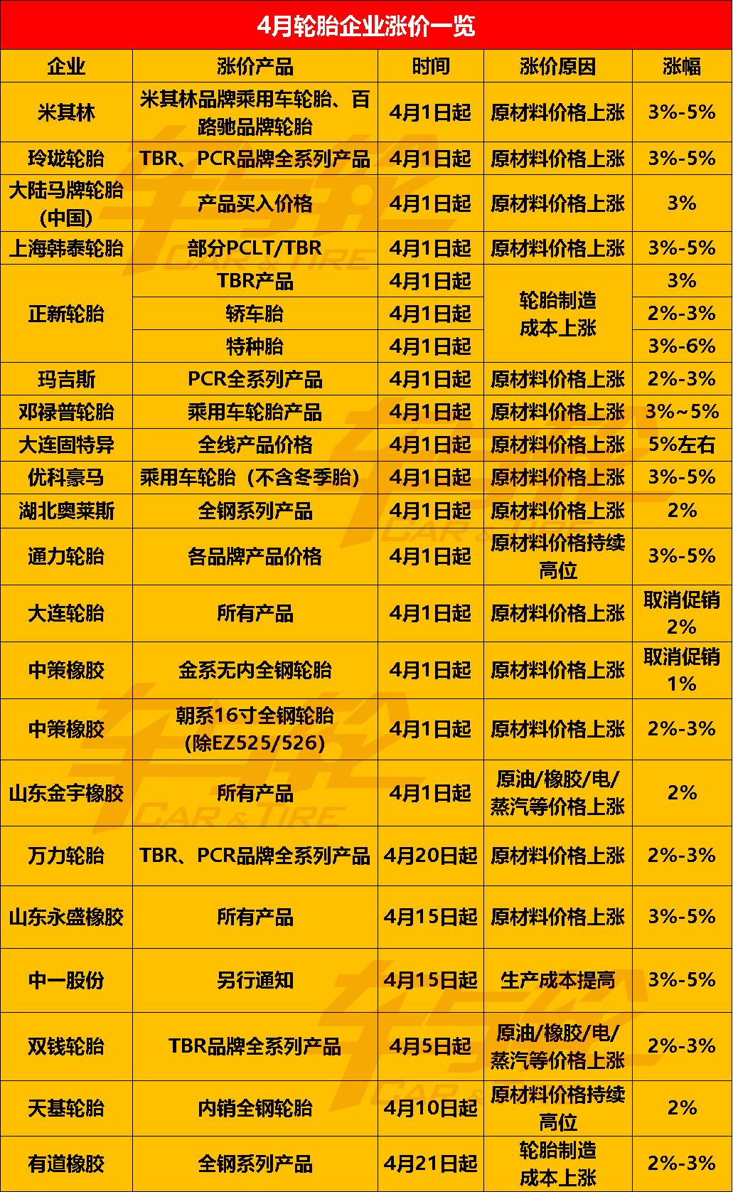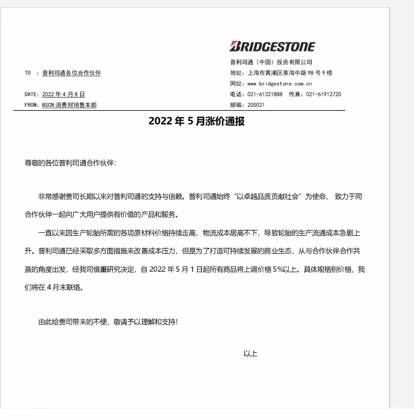 4月后宣布涨价的轮胎企业越来越多,巨头企业普利司通更是宣布涨价到5月!