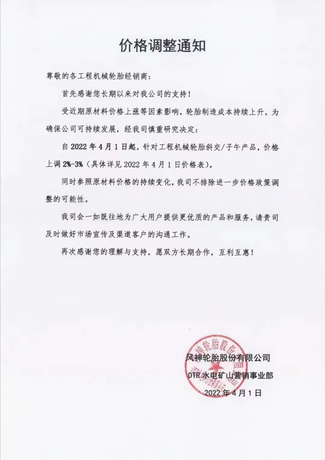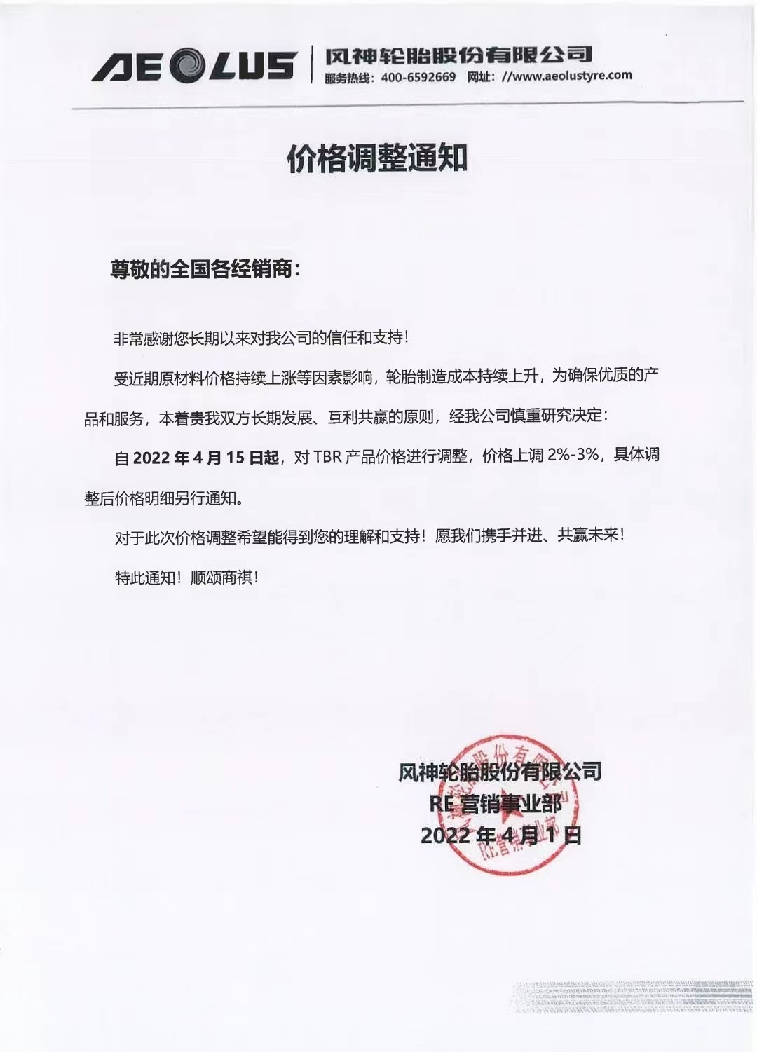 另外,风神轮胎连发两张通知单要对轮胎进行调价!风神轮胎宣布,从4月15日起,对TBR产品价格上调2%~3%,具体调整后价格明细另行通知。