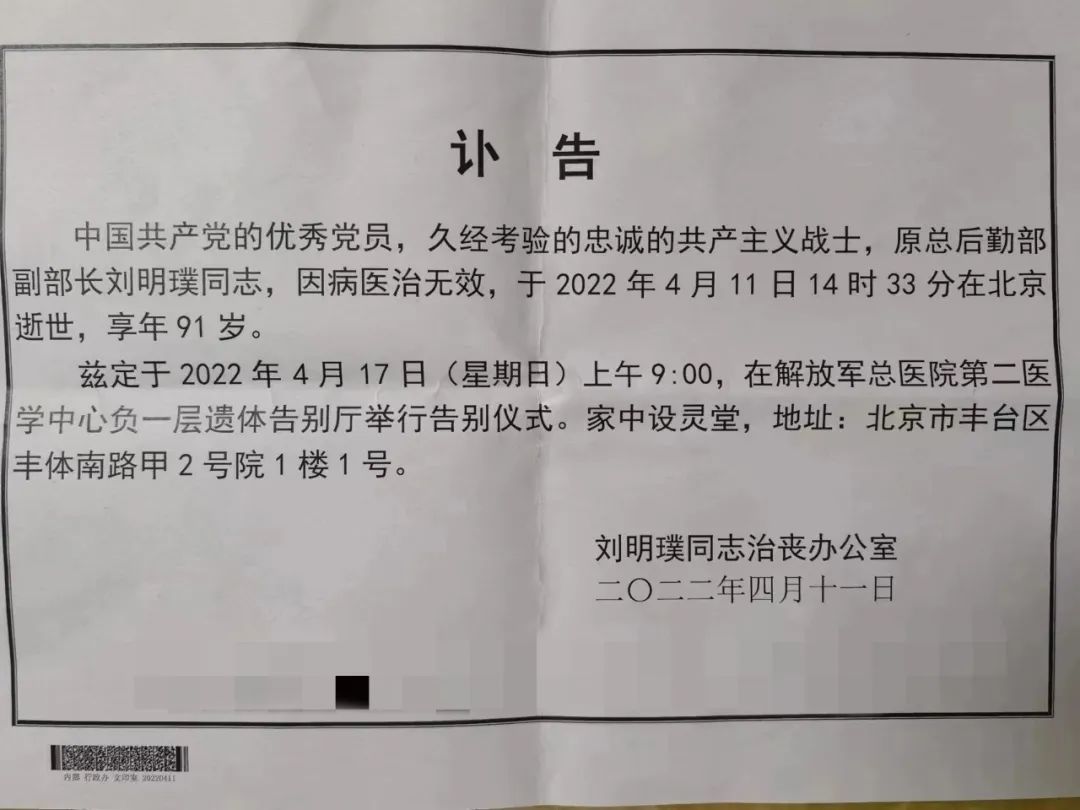 中国共产党的优秀觉员,久经考验的忠诚的共产主义战士,原总后勤部副部长刘明璞同志,于2022年4月11日14时 33分在北京逝世,享年91岁。
