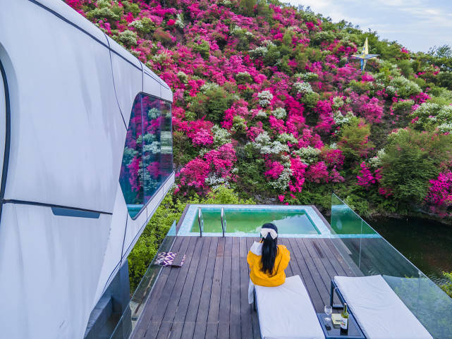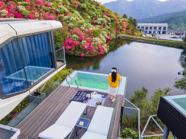 舱外有个小小的 “无边泳池”,一旁还有地毯,躺椅,桌子上摆放着红酒鲜花,感受鲜花配美酒的悬崖无边泳池,独属私人空间的小日子,享受精致生活的私密,慵懒,舒适。山水之间睡一晚,让月色温柔,让流星闪烁,仿佛眨一眨眼睛,便能让银河坠落感觉。