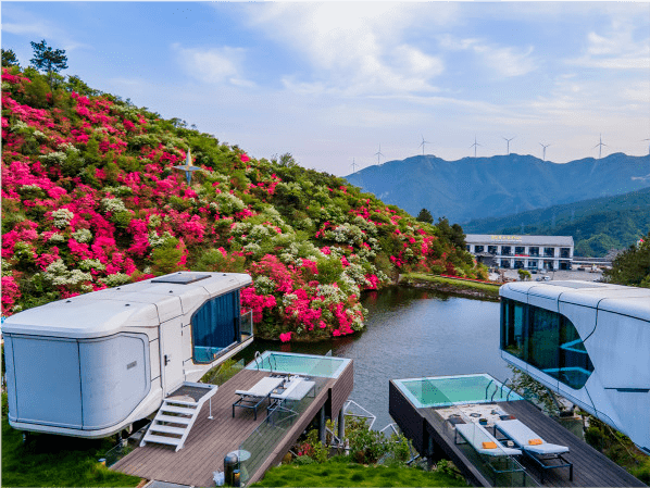 山川湖水,漫山花海,森林太空舱民宿住一晚