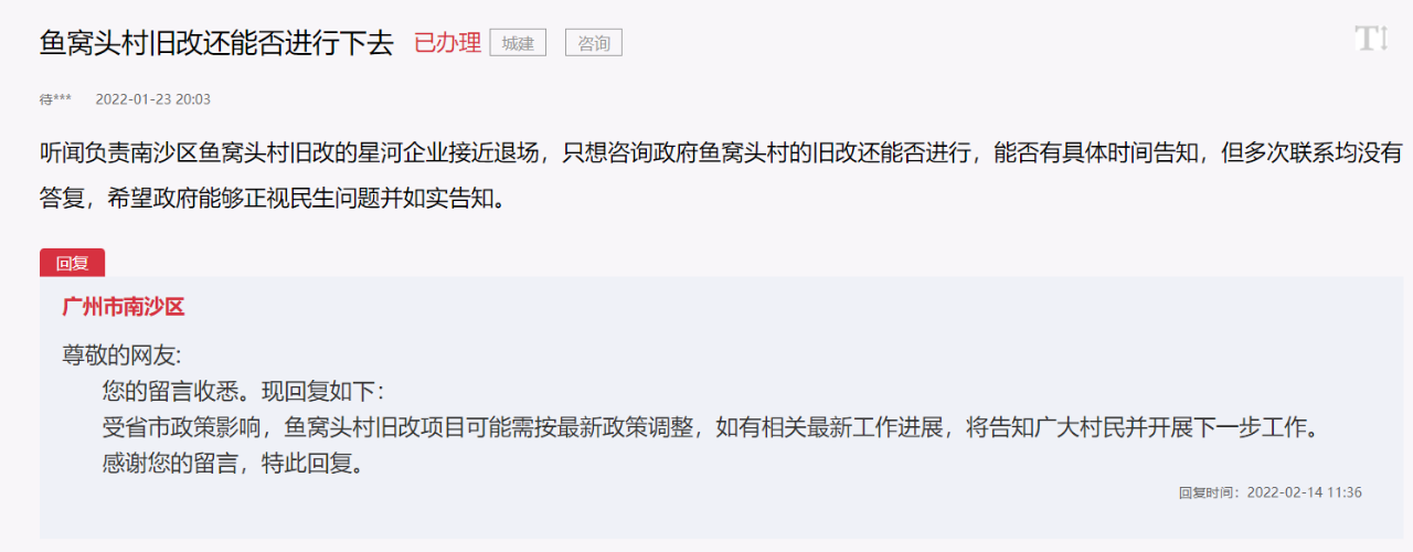 当时官方给予的回复是, “受省市政策影响,鱼窝头村旧改项目可能需按最新政策调整。”这一回复更令不少村民悬心。