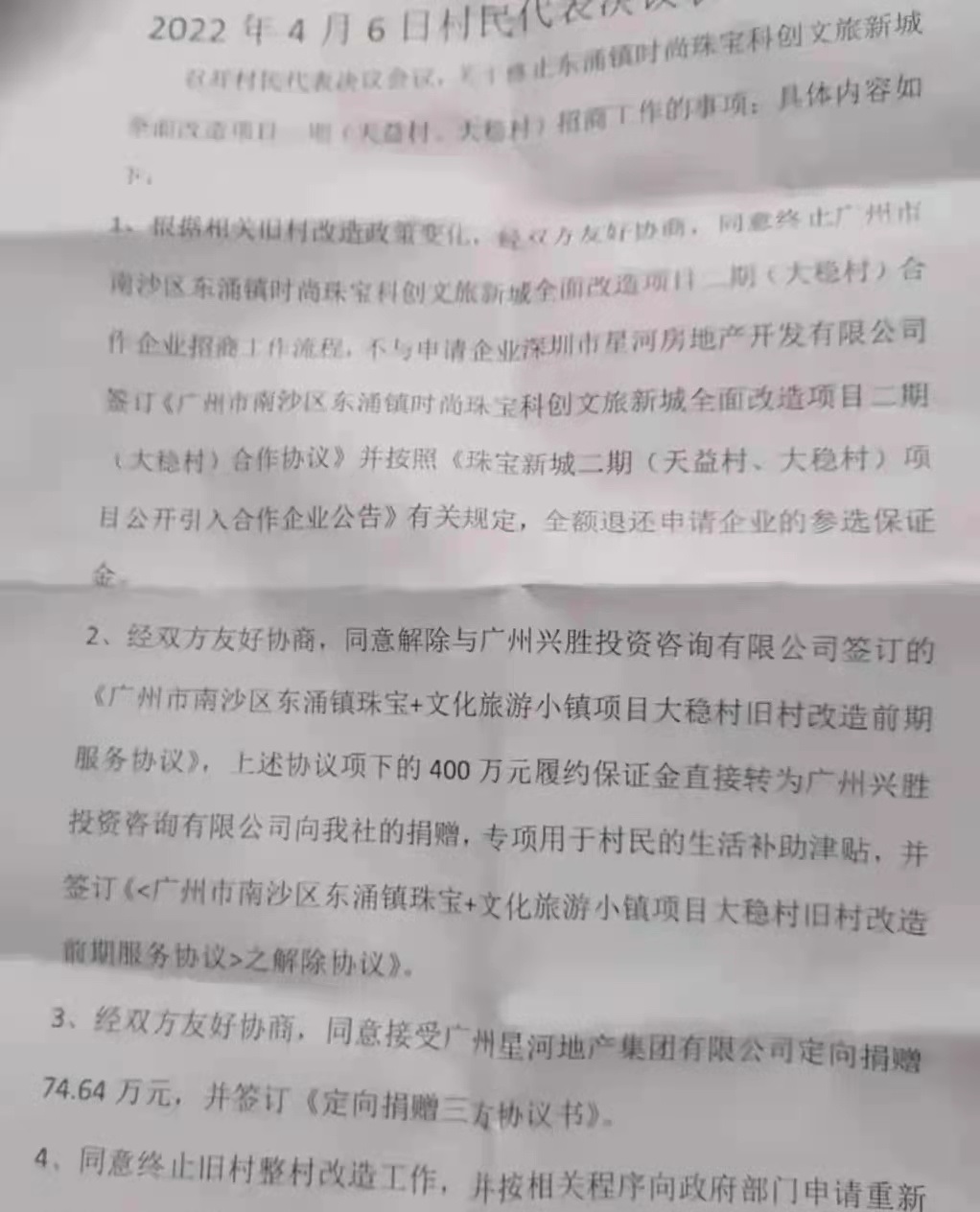 与星河(正式合作企业)、兴胜投资(前期服务公司)解除相关合作协议,而星河斥资1亿的参选保证金将全额退回,并大稳村捐赠74.64万元,而兴胜投资原400万履约保证金也转为捐赠,用于村民生活补助津贴。