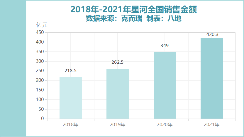 而星河这几年的经营状况也表现不佳。虽然此前星河喊话到2023年时,销售业绩要达到1500亿元,但截止到2021年时,其业绩只有420亿,与1500亿的目标差距悬殊。