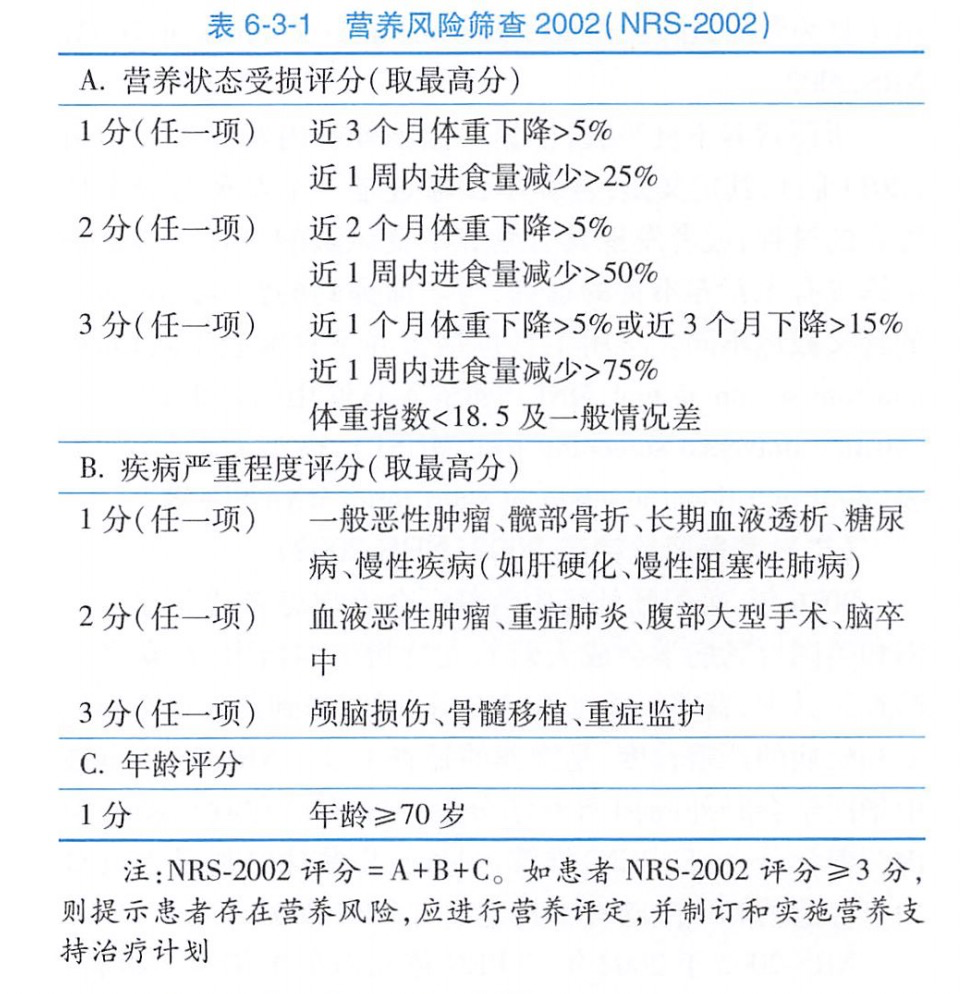会诊一般针对的是住院病人,在其他科的医生认为该患者可能需要营养干预时,则会请营养科会诊。营养科医生首先会对患者进行营养风险筛查和营养评估(或称营养评定)。在国内,一般营养风险筛查使用NRS-2002量表,判断患者的营养风险。NRS-2002由三个部分组成,营养状态受损评分、疾病严重程度评分和年龄评分。最高分7分,如果小于3分时说明该患者暂时没有营养风险,但是需要定期复核。如果总分大于等于3分,则说明该患者需要营养治疗。