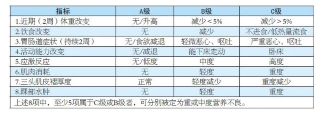 对于有营养风险的患者,需要继续进行营养评定。营养评定需要综合体格测量(如身高、体重、上臂围、肱三头肌皮褶厚度、握力等)、生化指标(血浆蛋白、血电解质、炎症指标等)、病史询问、其他检查等,确定营养不良的程度和类型。为后续的营养方案制定作依据。国内使用的比较多的是SGA量表。最后结果分为ABC等级。A级说明营养状况良好,B级说明中度营养不良。C级说明重度营养不良(如下图)。