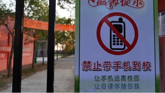 陶市小学位于村街的正中心,铁门的右边张贴着一张醒目的带叉的手机图标,下面一行红色大字:“禁止带手机到校”。