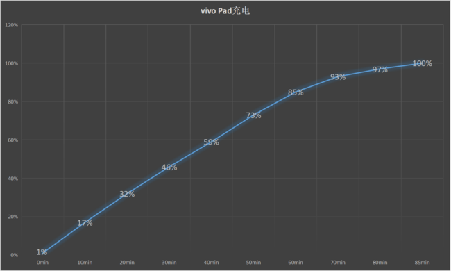 续航方面,vivo Pad内置8040mAh电池,属于目前平板电脑比较典型的一个容量,充电方面支持44W快充,实测从1%充至100%共用时85分钟,半小时可充至46%,1小时85%,还是稍微有些慢的,但是平板不像手机要一直拿着用,所以影响基本不大,当然如果充电时间控制在1小时以内,体验会好很多。