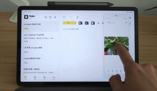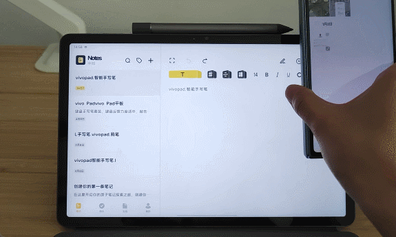 另外还有任务接力,内容跨屏同步等功能,手机上操作的任务可以继续在平板上操作,如通过原子笔记记笔记,看视频,处理邮件,接听电话等,以记笔记为例,在手机上编辑一半的笔记通过靠近vivo Pad底部右侧Dock栏会出现笔记图标,点击即可接力在平板上继续处理。而包括原子笔记、日历、原子阅读在内的「量子套件」实现了PC、平板、手机之间多设备的内容同步。