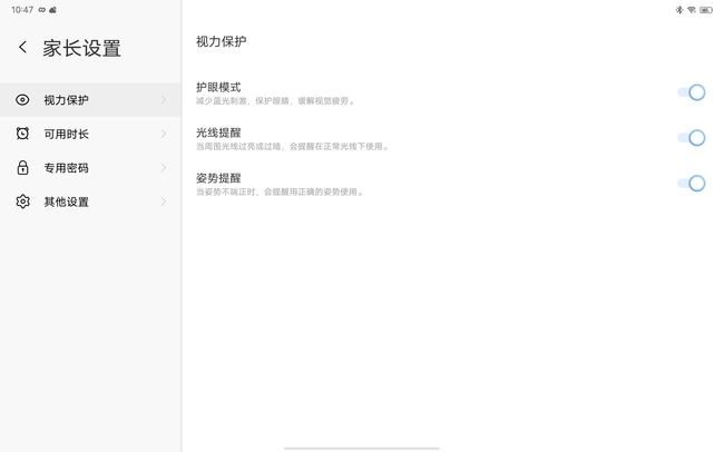 而且,相较其他平板的不同之处还在于,vivo Pad在屏幕上方前摄旁边加入了一颗TOF景深传感器,能够更准确检测孩子的用眼距离,配合前置摄像头和相关检测算法,当使用环境或观看姿势、距离不对时会及时提醒纠正,帮助孩子养成良好习惯。