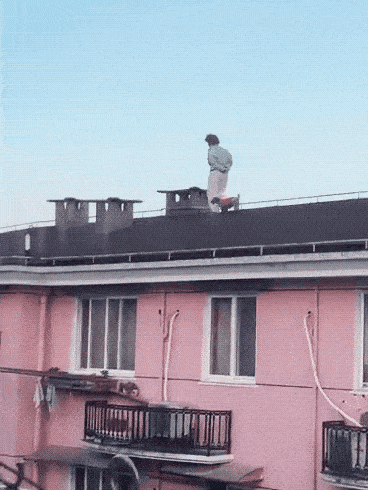 有人拍下邻居屋顶遛狗的画面,在小区群引起一阵轰动