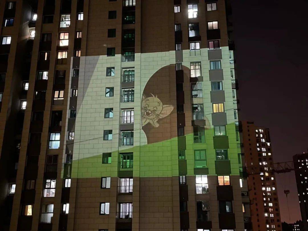 4月10号晚上,我们楼放了一场露天电影,怕影响老人休息,选了没有台词的《猫和老鼠》,用了超高清投影仪投在对面大楼的墙上。